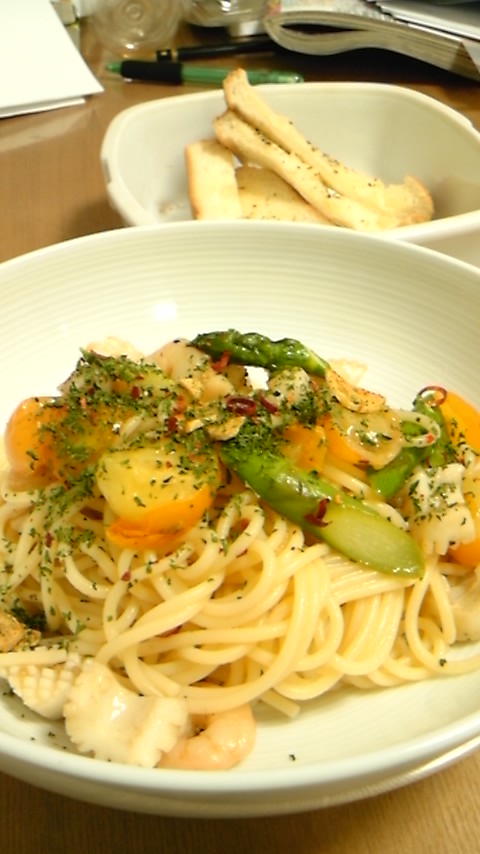 ゆうはん。 ペペロンチーノとガーリックトースト。この間食べたレモン風味のパスタが忘れられんのでペペを使ってつくってみたり。いや、あれはペペではなかったが;…ペペロンチーノにレモンなかなか合うと思う美味い^^冷たいとなお美味いんだろな…(ヌルイ今日食いもんばっかだな…食ったらすぐ作業;本気ヤバい…もうやだ自分………